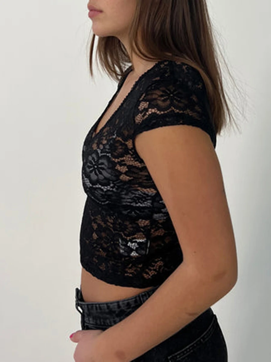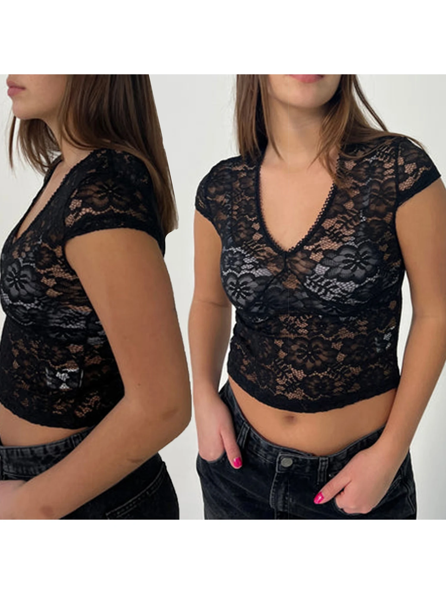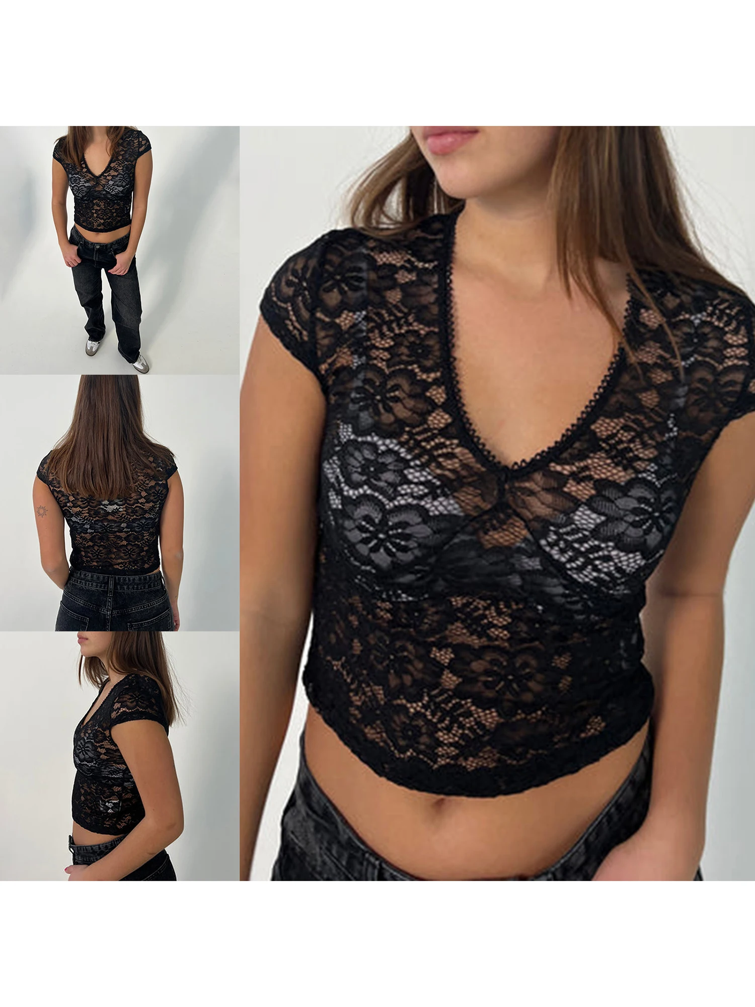 Women’s Lace Sheer Mesh Crop Tops Cap Sleeve V-Neck T-Shirt Fit Summer Clubwear